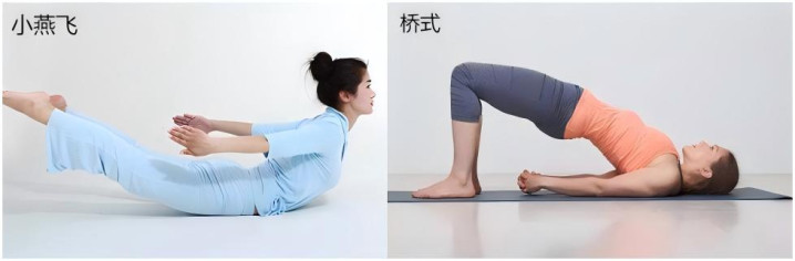 桥式:平卧,率性,双脚与肩同宽。以臀部发力,将身体抬起,使肩、髋、膝呈一条直线,保捏2-3秒后渐渐放下。