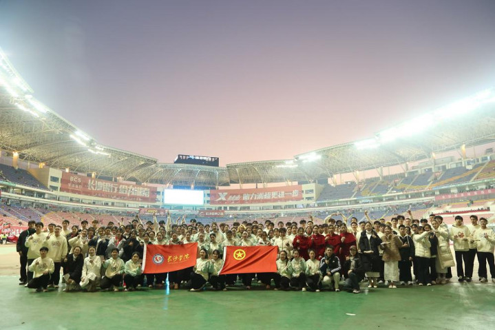 12月14日,湖南省重心打造的文旅体交融品牌赛事“湘超联赛”——四分之一决赛长沙主场对阵岳阳的赛程在贺龙体育馆热血开赛。长沙学院精确对接组委会需求,组建152东说念主的大学生志愿处事团队完成暖场饰演——不仅稳稳举起印有八强队标志的巨型球衣,还托举起巨型湘绣作品,将千年非遗古韵与芳华活力完好交融,成为畅通场上通盘靓丽的表象线。