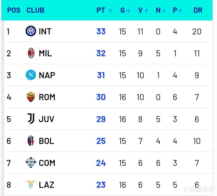 由于米兰双雄、那不勒斯、博洛尼亚均在沙特插足了本赛季的意大利超等杯,这4支球队都因此缺战了意甲第16轮比赛。界限当今,少赛一场的国米、米兰和那不勒斯名次积分榜前3位,罗马、尤文位列4-5名,前5名的积分等差1分,竞争十分胶著。