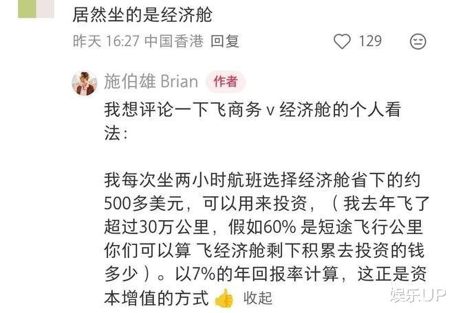 关于经济舱事件,施伯雄进一步算了一笔账:若以7%的年化收益筹办,节省的遨游开支通过复利投资将捏续升值。这种“审时度势的资产不雅”激励了不少职场东谈主的共识。有财经博主分析称,高净值东谈主群的破钞接管每每更谨防长期价值,而非单纯彰显身份。