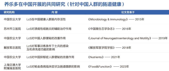在中国,养乐多与中国农业大学开展网络参谋,2015年,论文《副干酪乳酪杆菌代田株在中国健康东谈主群肠内存活性》在《微生物学与免疫学》国外期刊上发表。2016年,养乐多与苏州市立病院共同开展“益生菌网络好意思沙拉秦谐和溃疡性结肠炎的疗效和安全性的不雅察”的参谋后果发表。2019年和2021年,养乐多与中国农业大学共同开展的“副干酪乳酪杆菌代田株对中国便秘东谈主群关连症状不同的影响”和“副干酪乳酪杆菌代田株对抑郁症患者的便秘影响”两项参谋后果络续发表。2023年,养乐多与上海交通大学医学院从属瑞金病院网络发布“LcS对帕金森病临床症状及肠谈菌群的影响”参谋后果。