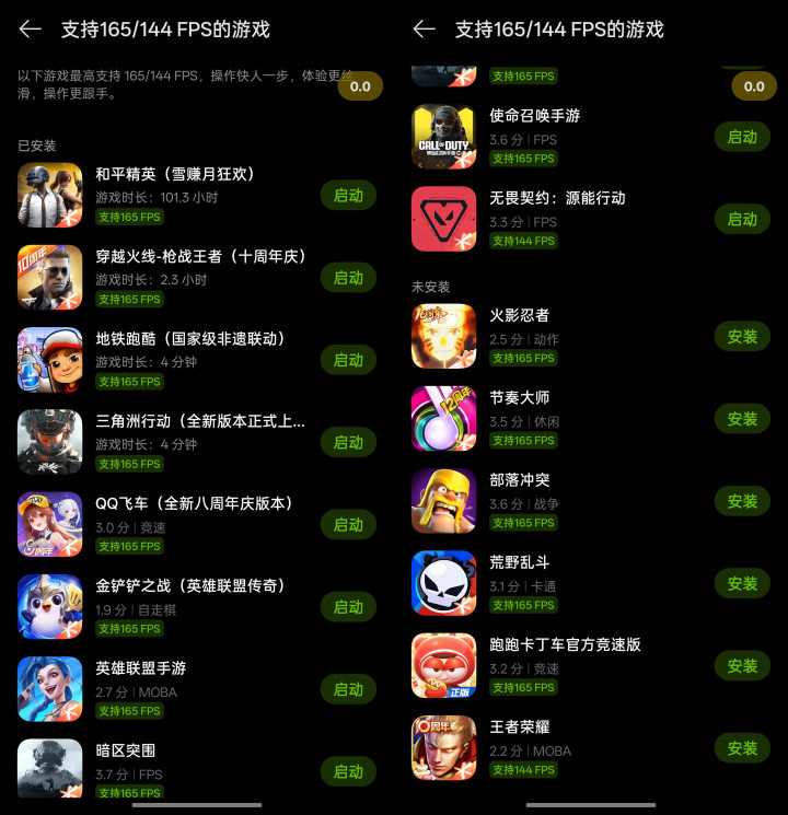 实测嘛,不是卡不卡的问题,而是仍是骁龙6连60帧皆不稳,当今能径直开到165Hz了。上头是复旧165Hz / 144Hz的游戏,常玩的射击游戏基本通吃,况且《铁汉定约》和《王者荣耀》当今也别离复旧165Hz和144Hz了,游戏体验妙手一等。